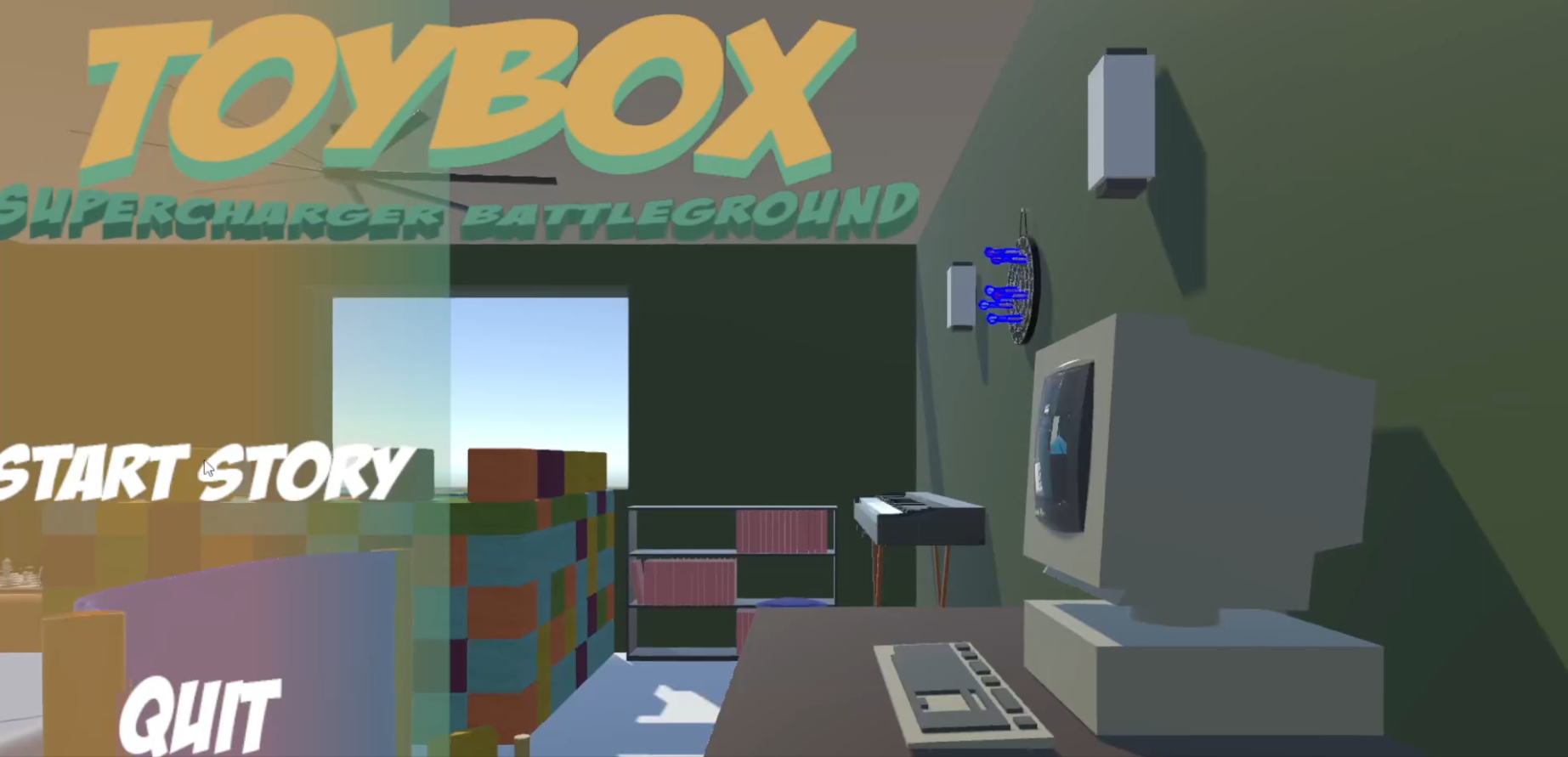 ToyBox Supercharger Battleground is a movement based arena shooter where you play as a kid's favorite toy trying to prove that you are his best toy.